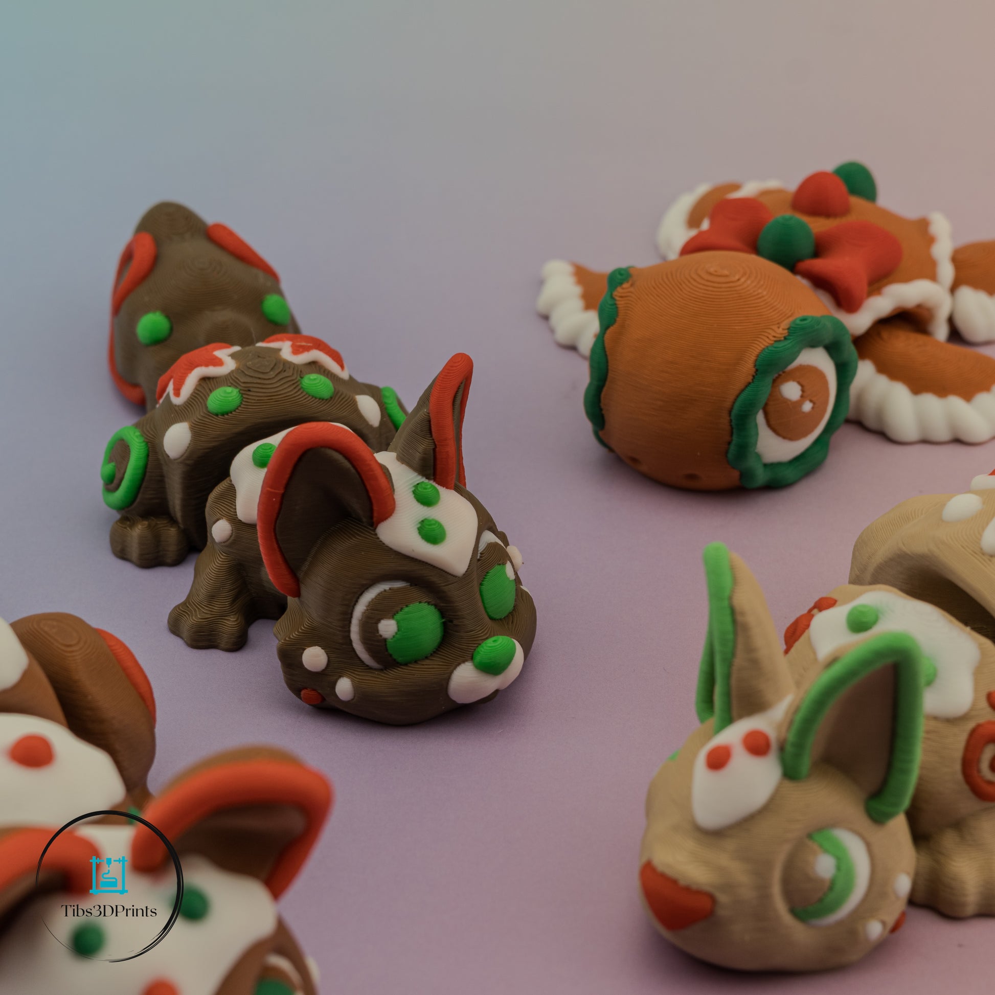 Each critter is designed with that classic gingerbread aesthetic – warm browns, creamy frosting whites, and pops of red and green candy accents. The articulated design means these little cuties can be posed and played with, making them perfect for kids and collectors alike.